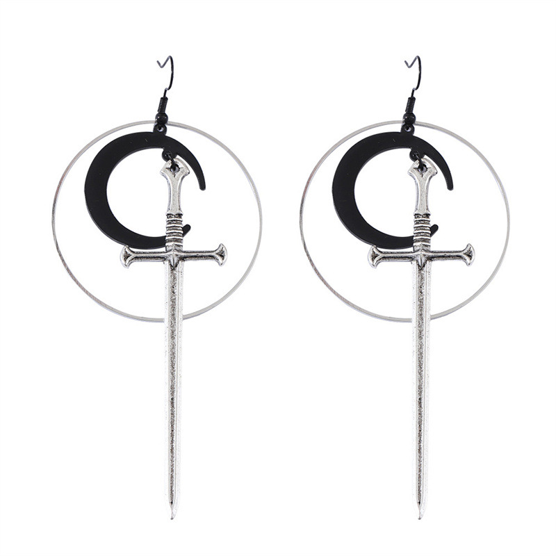 # Fashionable Gothic Silver Hoop Black Moon Sword Earrings For those who walk the line between worlds—where magic meets metal and darkness dances with defiance—these gothic silver hoop earrings command attention with their bold, exaggerated design. Each piece features a crescent moon cradling a gleaming sword, a symbol of the warrior within, the witch who refuses to be tamed. The silver catches candlelight and moonbeams alike, casting shadows that tell stories of ancient power and modern rebellion. These aren't mere accessories; they're declarations of identity for the alternative soul who embraces the unconventional. Whether you're channeling your inner sorceress at a midnight gathering or making a statement in everyday life, these earrings transform your presence into something unforgettable. The dramatic silhouette frames your face with an otherworldly elegance, perfect for anyone who believes that true beauty lies in the shadows, in the spaces where magic is born. Wear them and let the world know: you are fierce, you are free, and you are unapologetically yourself.