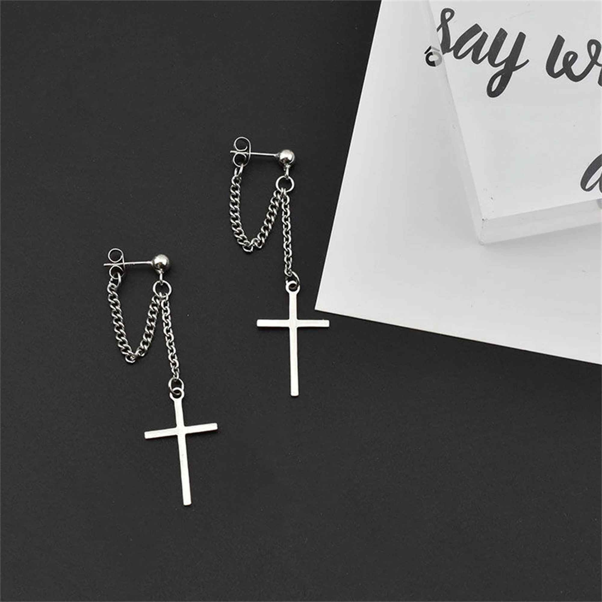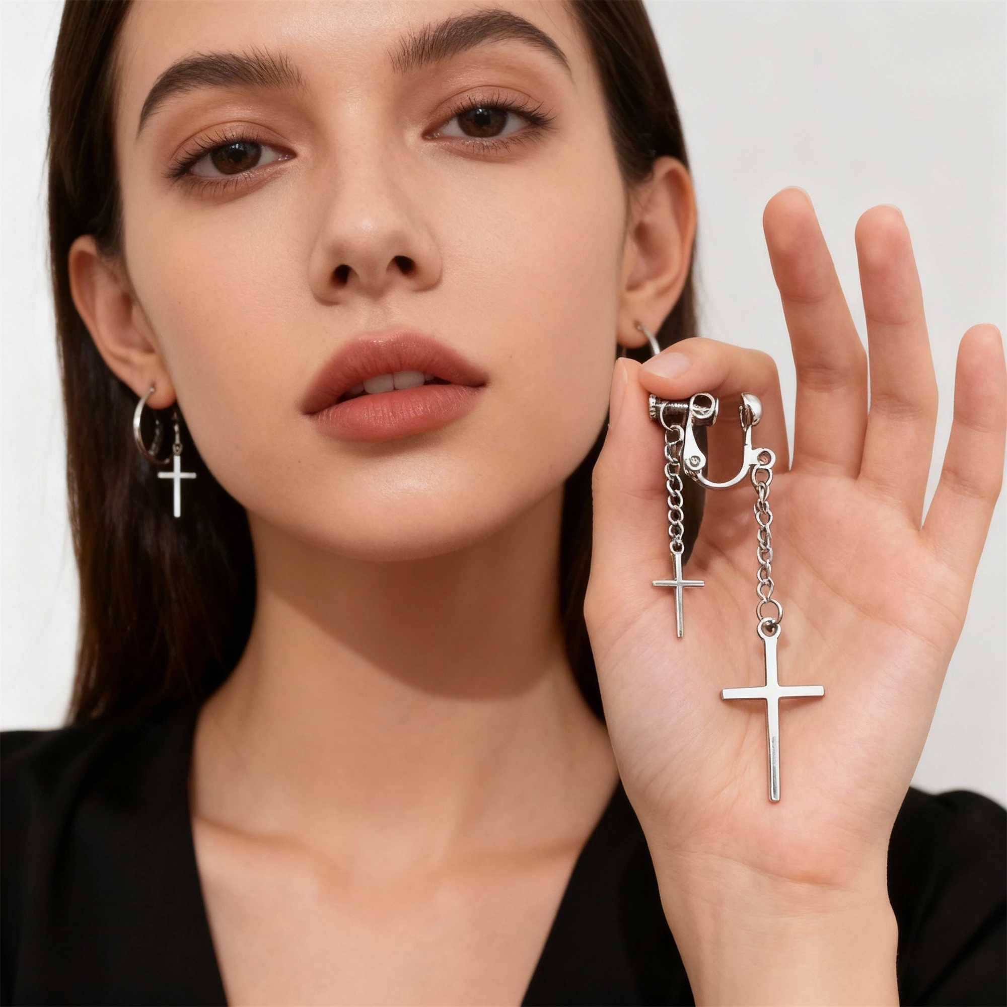 # Gothic Cross Chain Ear Cuffs No Piercing Clip On Earrings Declare your devotion to dark aesthetics without the commitment of piercing. These gothic cross chain ear cuffs blend ecclesiastical symbolism with streetwear rebellion, offering an edgy alternative for those who refuse to be confined by convention. The secure clip-on design grips comfortably against your ear, allowing you to experiment with your look—swap them between ears, layer them with other pieces, or wear them solo as your statement of faith in the unconventional. Crafted for the modern punk spirit who walks between worlds, these cuffs work equally well for men and women seeking to express their darker sensibilities. Perfect for festivals, nights out, or everyday defiance against the ordinary.