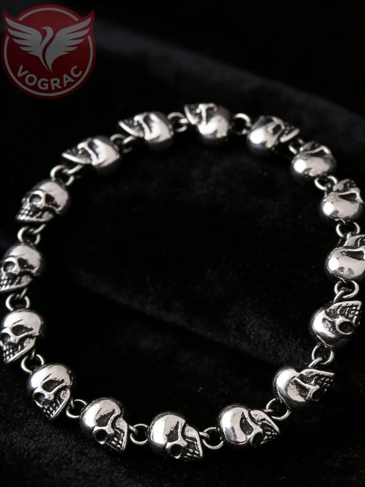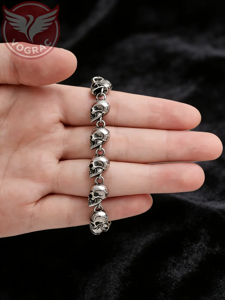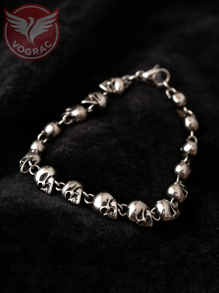 # Product Description Skulls don't whisper—they roar. This stainless steel bead-linked bracelet channels the raw defiance of gothic punk and biker culture, where mortality becomes a badge of honor and style. Each skull bead is a small rebellion, a reminder that life's too short to play it safe. Built tough from quality stainless steel, it won't tarnish, won't fade, and won't apologize for its presence. The linked strand design gives it a fluid, almost hypnotic movement—the kind of piece that catches eyes in dimly lit rooms and speaks volumes without a single word. Unisex in its appeal, it works equally fierce on anyone brave enough to wear their edge openly. Whether you're gifting it to someone who lives by their own code or claiming it as your own armor, this bracelet is more than jewelry—it's a declaration. Perfect for those who understand that true strength looks like a skull staring back at the world without flinching.